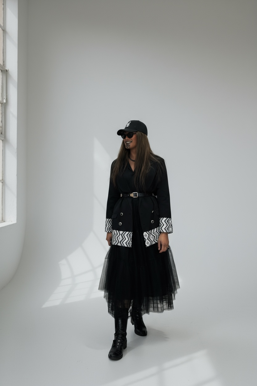 This piece is tailored for shape, finished with tānikō-inspired detailing along the cuffs and hem. The double-breasted front and polished metal hardware give it structure, while the waist belt lets you cinch it in for a fitted silhouette.