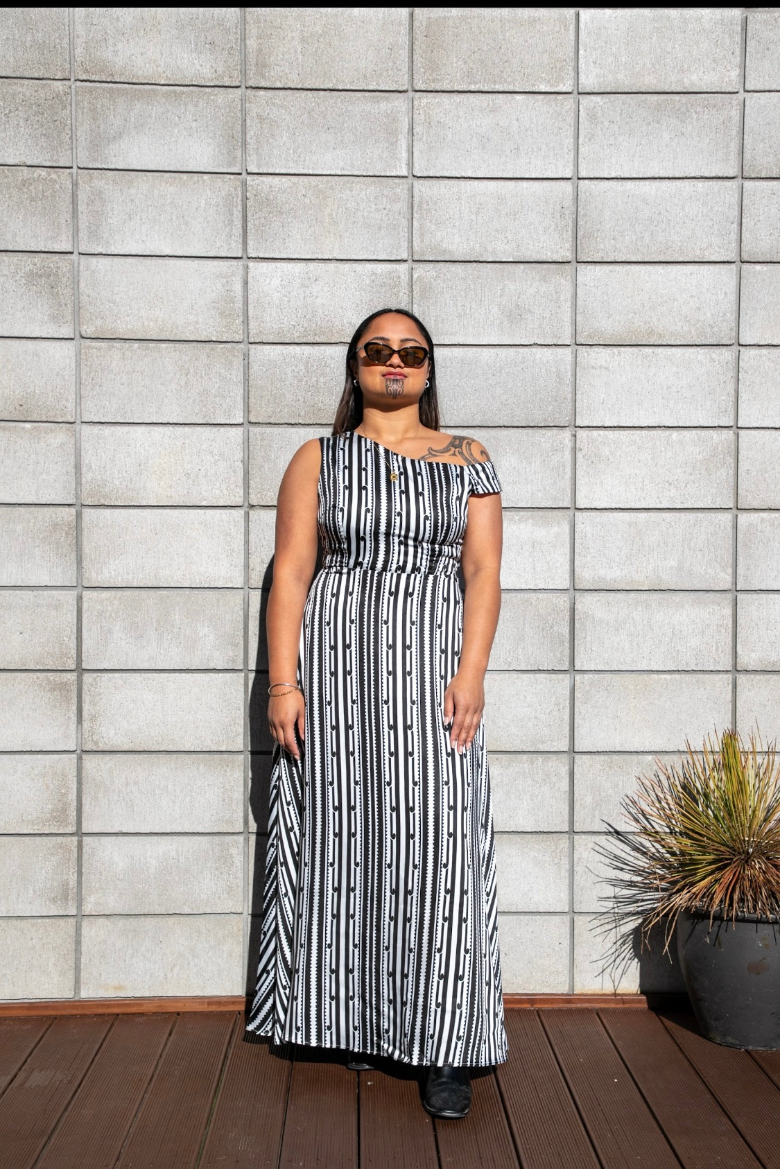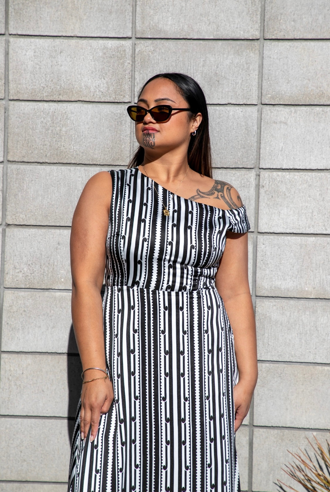 Grounded in legacy and made to be seen. The Iho Dress is a full-length satin piece that flows with intention and form. Designed for wāhine who carry mana in their stride, it features a bold one-shoulder silhouette and a tāniko-inspired print that tells a story of strength and movement.